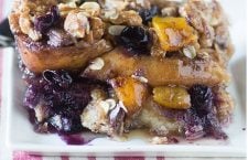 Cut french bread into 1/4 inch to 1/2 inch thick slices and place in 9 X 13 baking dish. This french toast bake has to layers so cut smaller if needed to fit 2 layers of bread. Arrange bread on bottom layer and cut enough for the a second layer. Dice peaches into small cubes. Sprinkle with 3 tablespoons sugar and 1/2 tablespoon cinnamon. Rinse blueberries and sprinkle with 1 tablespoon sugar. Sprinkle half the diced peaches on top of the bottom layer of bread. Add second layer of bread. Sprinkle the top layer with peaches and blueberries.