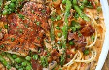 Creamy tomato and mozzarella spaghetti with sliced chicken and bacon. Spring vegetables like asparagus, peas, onions and mushrooms add exceptional flavor to this dish.