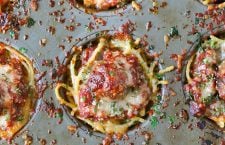 Toss spaghetti with 3/4 cup Parmesan cheese crumbs, diced jalapenos and 1 + 1/2 tablespoons finely chopped parsley. Spray a 12 cup muffin tin pan well with cooking spray. Spoon noodle mixture into tins, filling it nearly to the top. Spoon 1 tablespoon pasta sauce onto each noodle cup. Slightly press sausage tips into each cup.