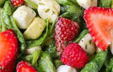 A light Strawberry Avocado Mozzarella Salad is a fresh spinach salad with strawberries, raspberries, avocado, and mozzarella cheese balls tossed in a simple homemade salad dressing of olive oil, balsamic vinegar, freshly squeezed lemon juice, and basil. An easy summer appetizer, holiday side dish, or potluck recipe.